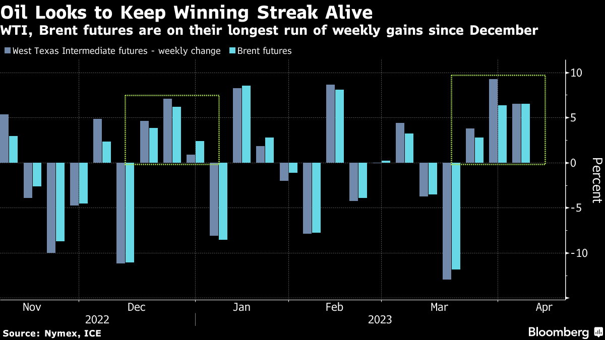 Oil prices are benefiting from renewed concerns over a tightening market, especially after OPEC+’s surprise decision to slash more than 1 million barrels of daily output starting in May. Reports this week from OPEC, the IEA and EIA will shed further light on the supply picture, with further inventory drawdowns likely supporting price gains. Combined with a backdrop of global economic uncertainty and questions over the path of Fed interest-rate hikes, near-term volatility can also be expected.