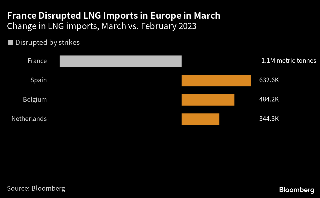 Three of France’s liquefied natural gas terminals have been largely blocked by the strikes since early March. A fourth, Dunkerque LNG on the English Channel, faces regular interruptions. Ships hauling the fuel have diverted to nations including Spain and the UK.
