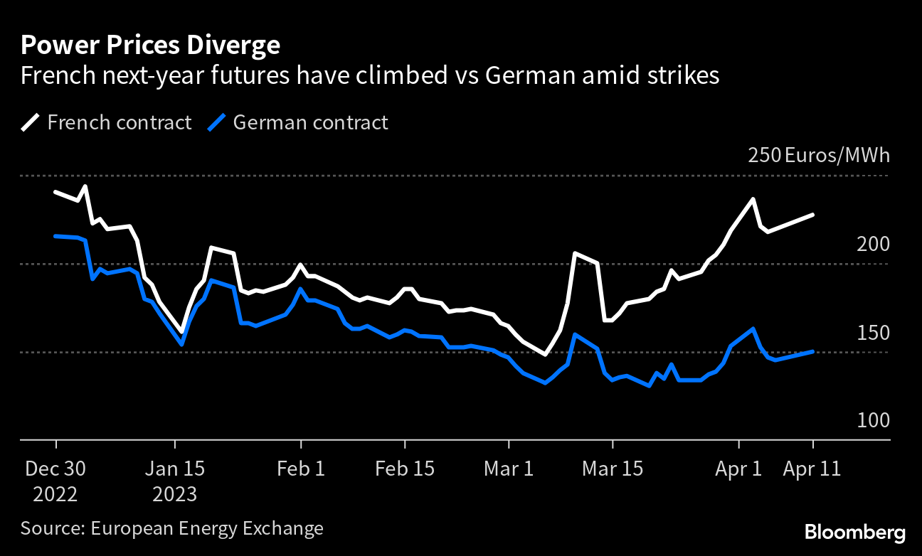 The combined punch of strikes and renewed nuclear concerns has sent French electricity prices soaring. Futures for power delivery next year have risen by about 50% since early March, to more than €220 per megawatt-hour. While that price pales in comparison to the record levels in August, it’s much higher than the German equivalent contract.