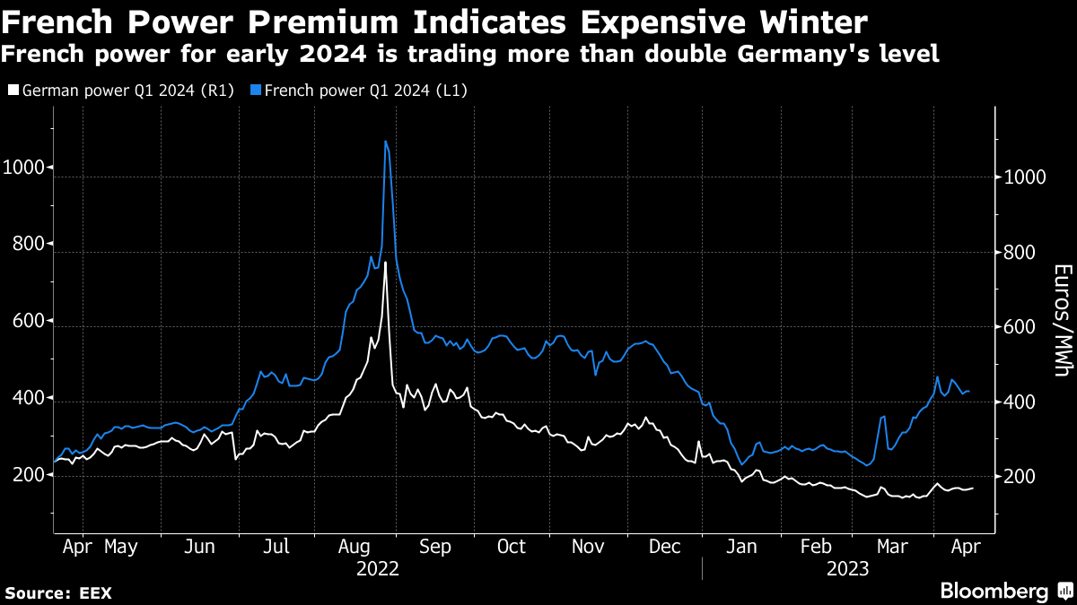 (Bloomberg) -- France’s weakened nuclear power output means the cost of its electricity for next winter is more than twice as expensive as Germany’s, as concerns over the health of the country’s reactors persist.