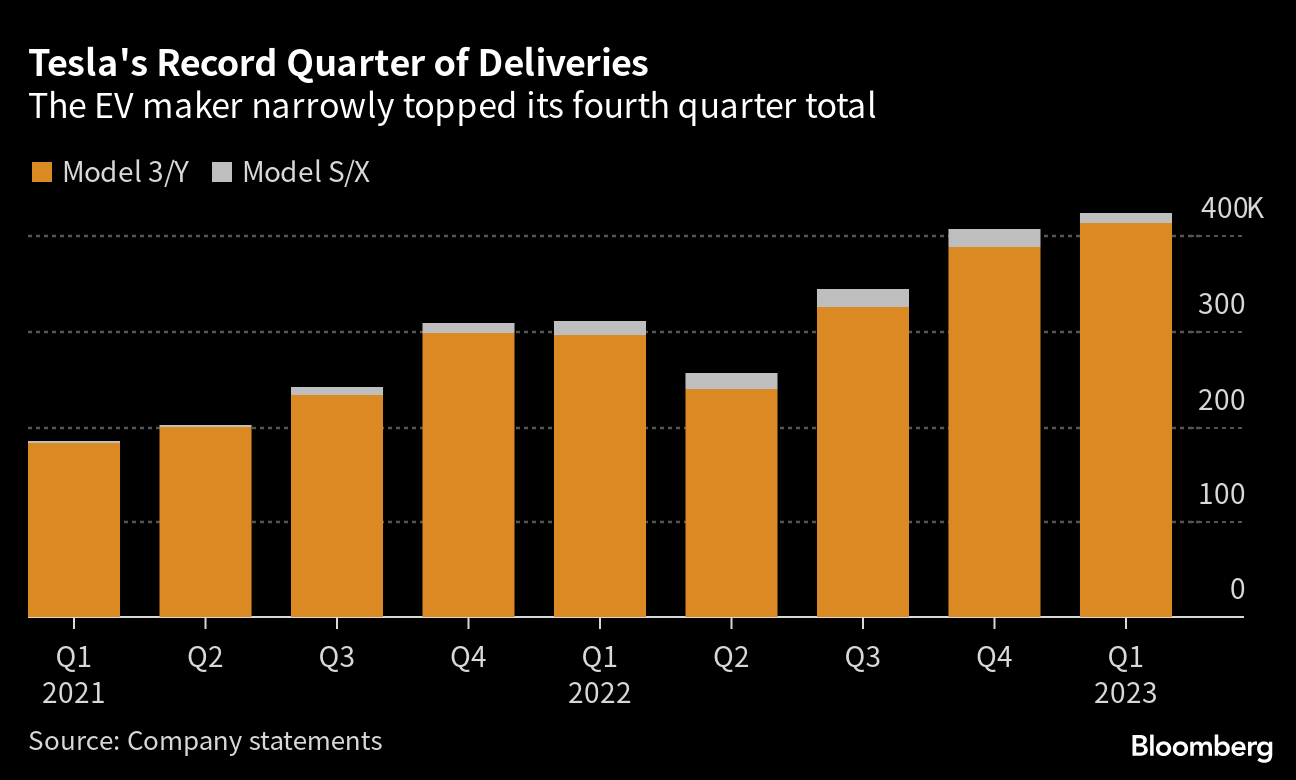 The electric-vehicle maker handed over 422,875 cars to customers in the first three months of the year, exceeding its fourth quarter total by about 4%. The result narrowly beat the average estimate of analysts surveyed by Bloomberg of 421,164 vehicles.