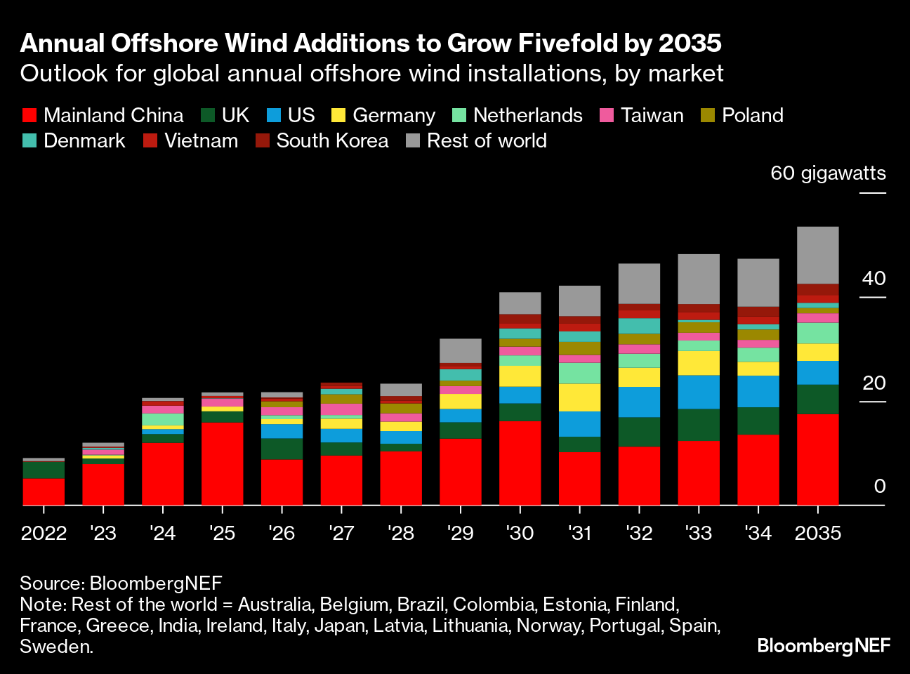 The offshore wind industry has had a lackluster year with canceled and delayed projects in Europe and the US leading to multibillion dollar writedowns. But global additions are forecast to be five times the total in 2022 by the middle of next decade, with Asia playing a prominent role in driving the gains, according to BloombergNEF.