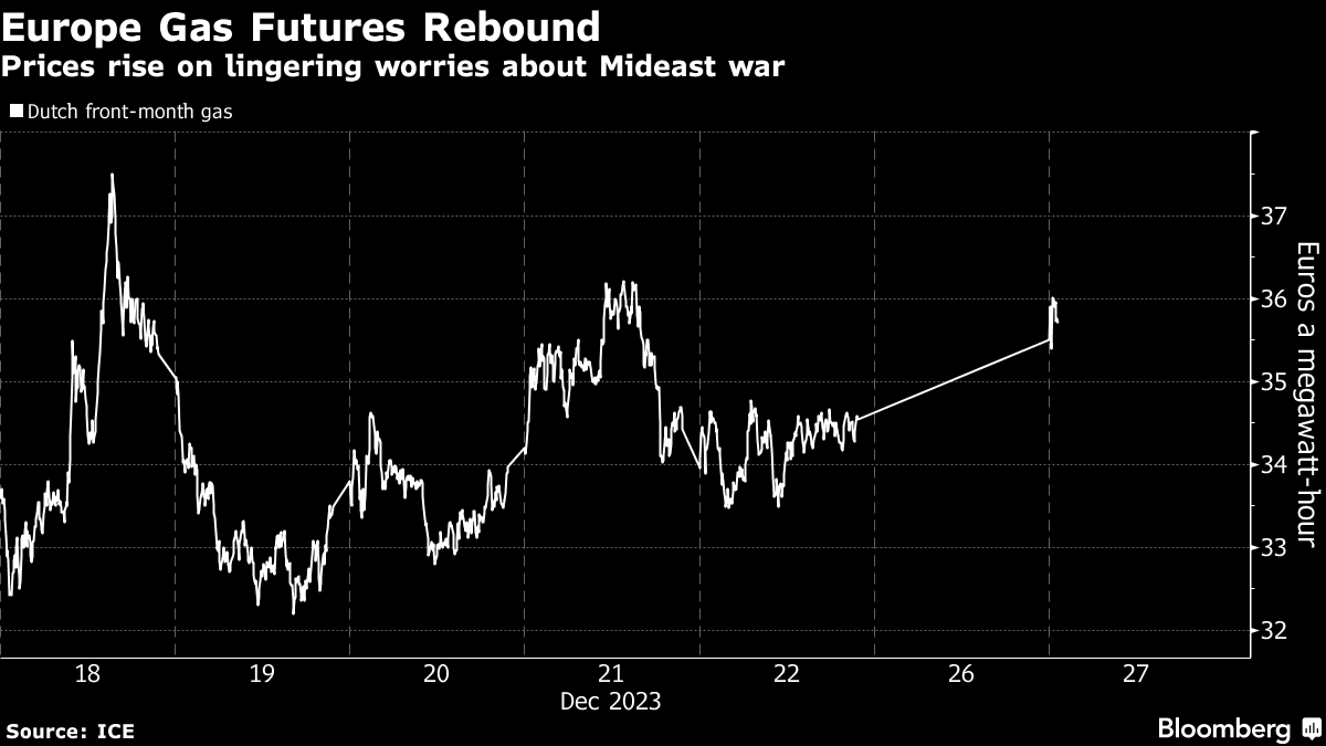 While ship diversions haven’t had a big impact on supplies yet, the market remains on high alert given potential threats to major transit routes for energy exports. Some liquefied natural gas cargoes have been changing course for longer voyages lasting more than a month as they avoid the Red Sea, according to ship-tracking data on Bloomberg.