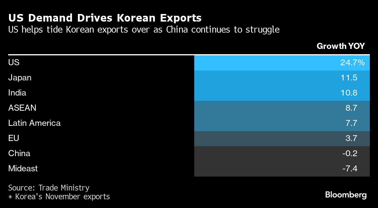 Still, there’s reason for caution. Economists see softening global economic activity next year, undermining demand for export products from countries like South Korea. The US in particular may see consumption slow as the benefits from fiscal investment programs dissipate, according to a forecast by the Bank of America.