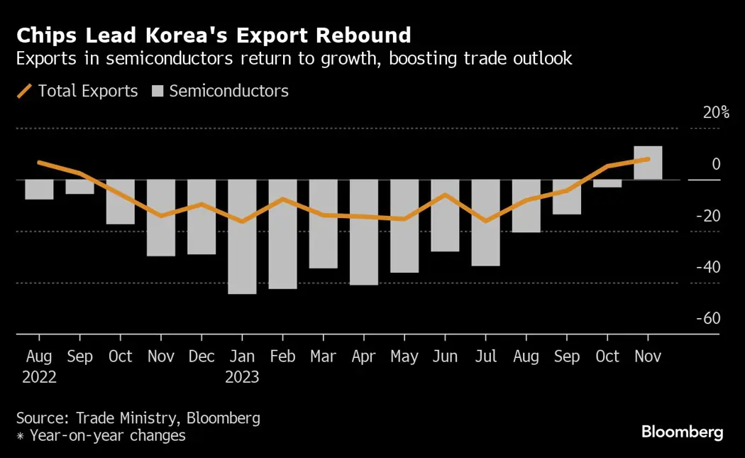(Bloomberg) -- The recovery in South Korea’s exports accelerated in November on the back of a rebound in semiconductor demand, boosting optimism for the country’s economic outlook and global trade next year.