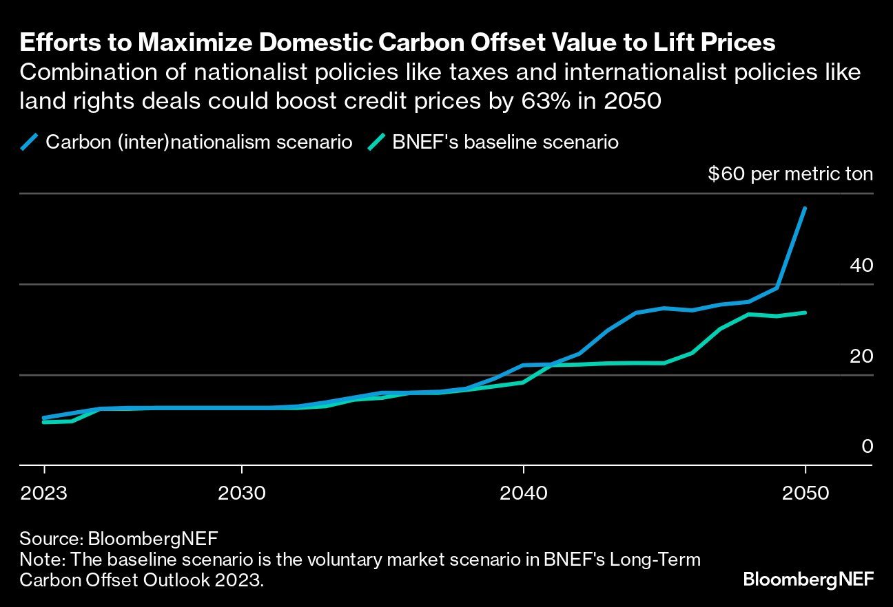 Drivers include the mere fact that many companies will be unable to meet net zero goals without using offsets, along with the prospect of national restrictions. Such dynamics set the stage for a considerable price bump by mid-century, BNEF estimates.