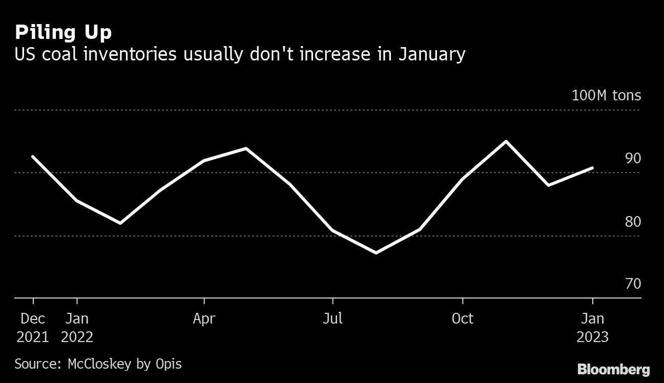 Milder-than-expected weather that weakened demand has allowed stockpiles to swell, and coal prices are falling. The power-plant fuel also is facing competition from natural gas, which hasn’t been this cheap since late 2020. There are concerns that coal-fired US utilities will seek to delay contracted deliveries this year.