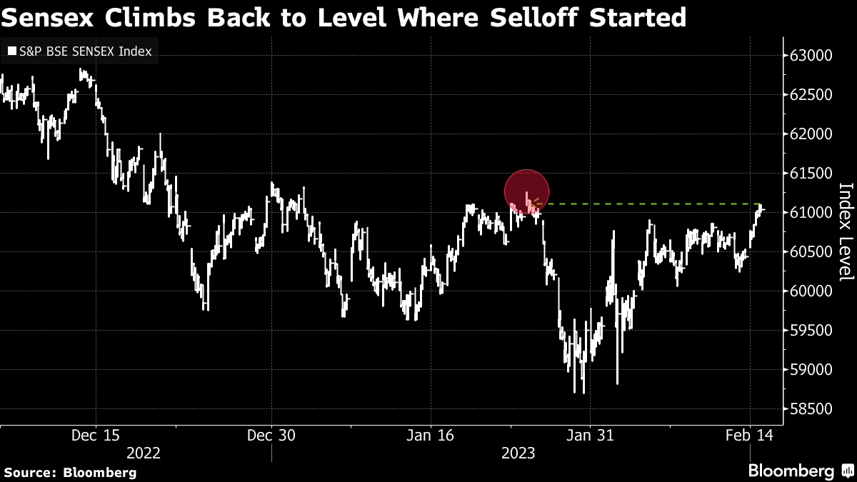 While sentiment over the broad Indian market took a hit after US-based Hindenburg Research on Jan. 24 accused the Adani Group of share manipulation and fraud — charges the conglomerate denies, the selloff has proven short lived. The country’s benchmark Sensex, which doesn’t count Adani stocks as its members, recouped all of those declines as of Tuesday’s close.
