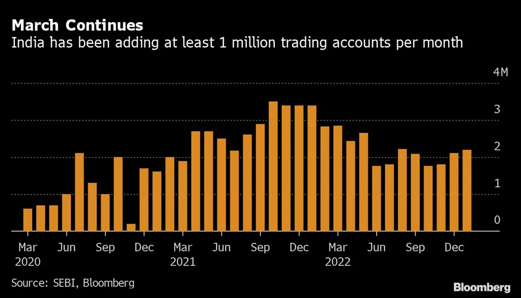 Retail investors such as Mistri are part of a groundswell that is changing the face of the world’s second-biggest emerging market. Roughly 1 million new trading accounts are opened every month, and the total has now climbed above 110 million, more than the populations of South Korea and Spain combined.