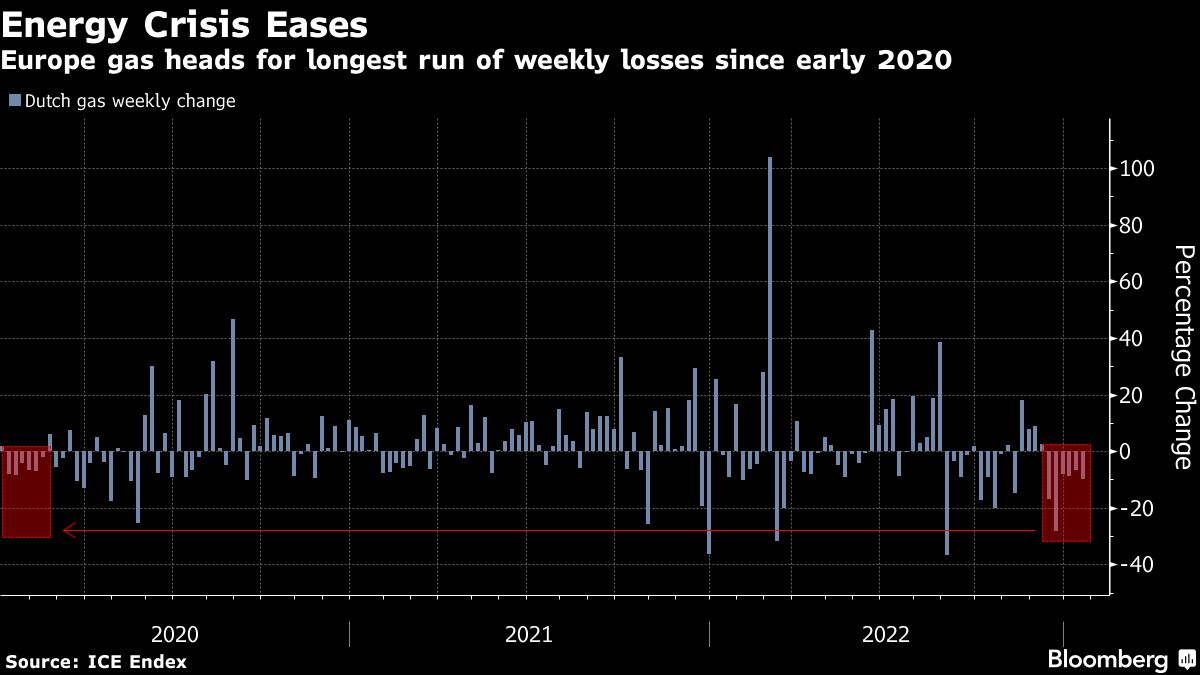 Gas prices have dropped significantly over the past month due to the mild winter, easing a historic energy crisis that has fueled inflation. Storage levels remain well above seasonal norms — even after recent withdrawals amid the cold snap — and the region continues to pull in imports of liquefied natural gas.