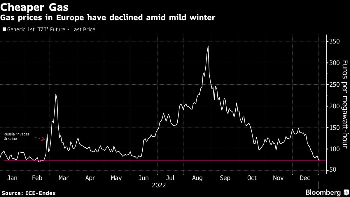 After a year of extreme volatility — with energy costs reaching record highs amid Russia’s war in Ukraine — the market starts 2023 less stressed. Gas prices declined about 47% in December as Europe managed to replace much of Russia’s curbed flows with supplies of liquefied natural gas.