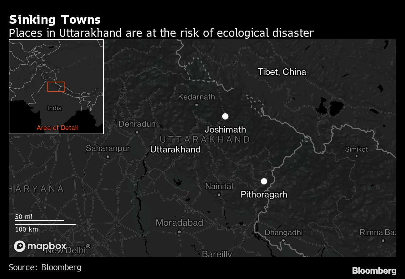 (Bloomberg) -- A sinking Himalayan town is highlighting the dangers posed to the region and the fragile ecology of the mountain range disturbed by a proliferation of dams, roads and military sites near the border with China.