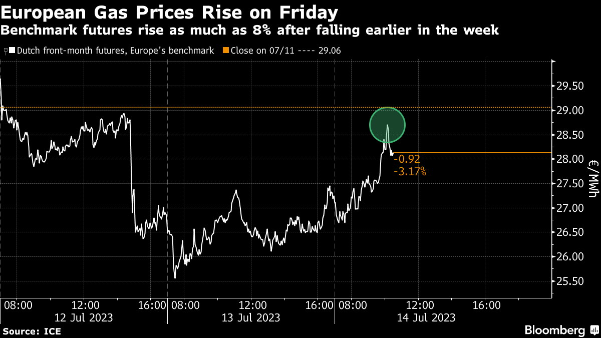 (Bloomberg) -- European natural gas prices trimmed their weekly drop on Friday as heat blankets the continent’s south and risks raising cooling needs.