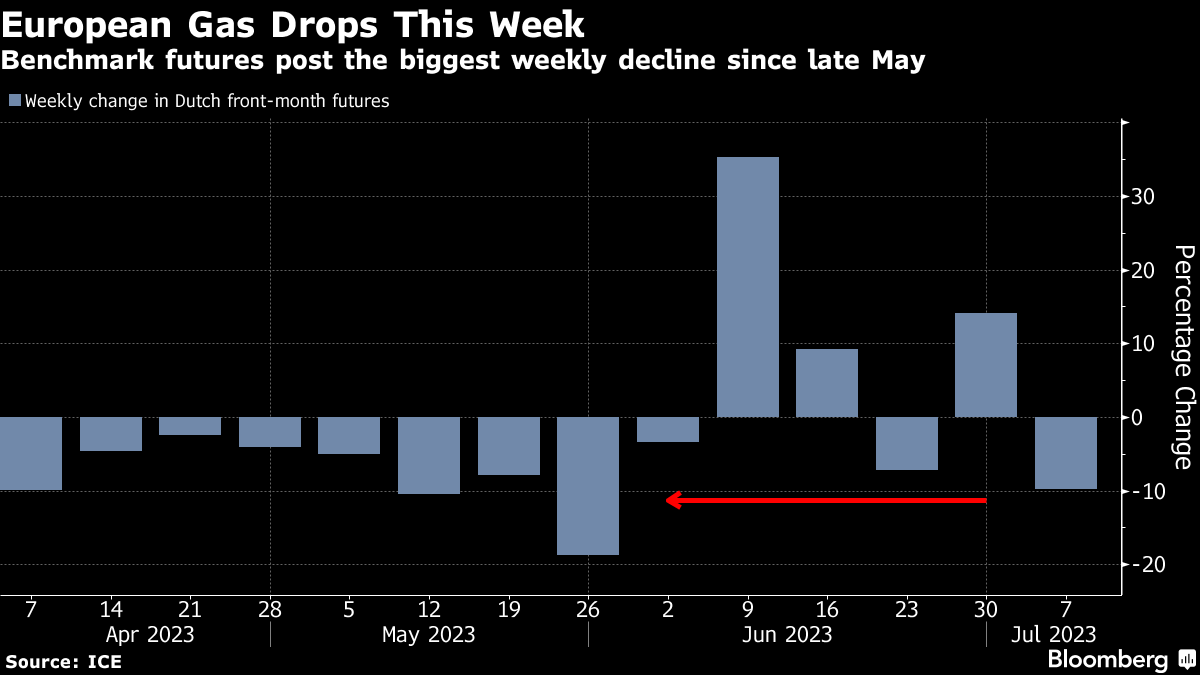 (Bloomberg) -- European natural gas prices posted their biggest weekly drop since May as rising inventories and lackluster demand outweigh supply and weather-related risks.