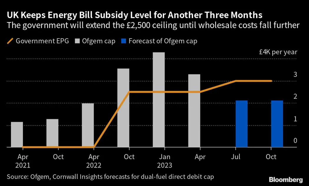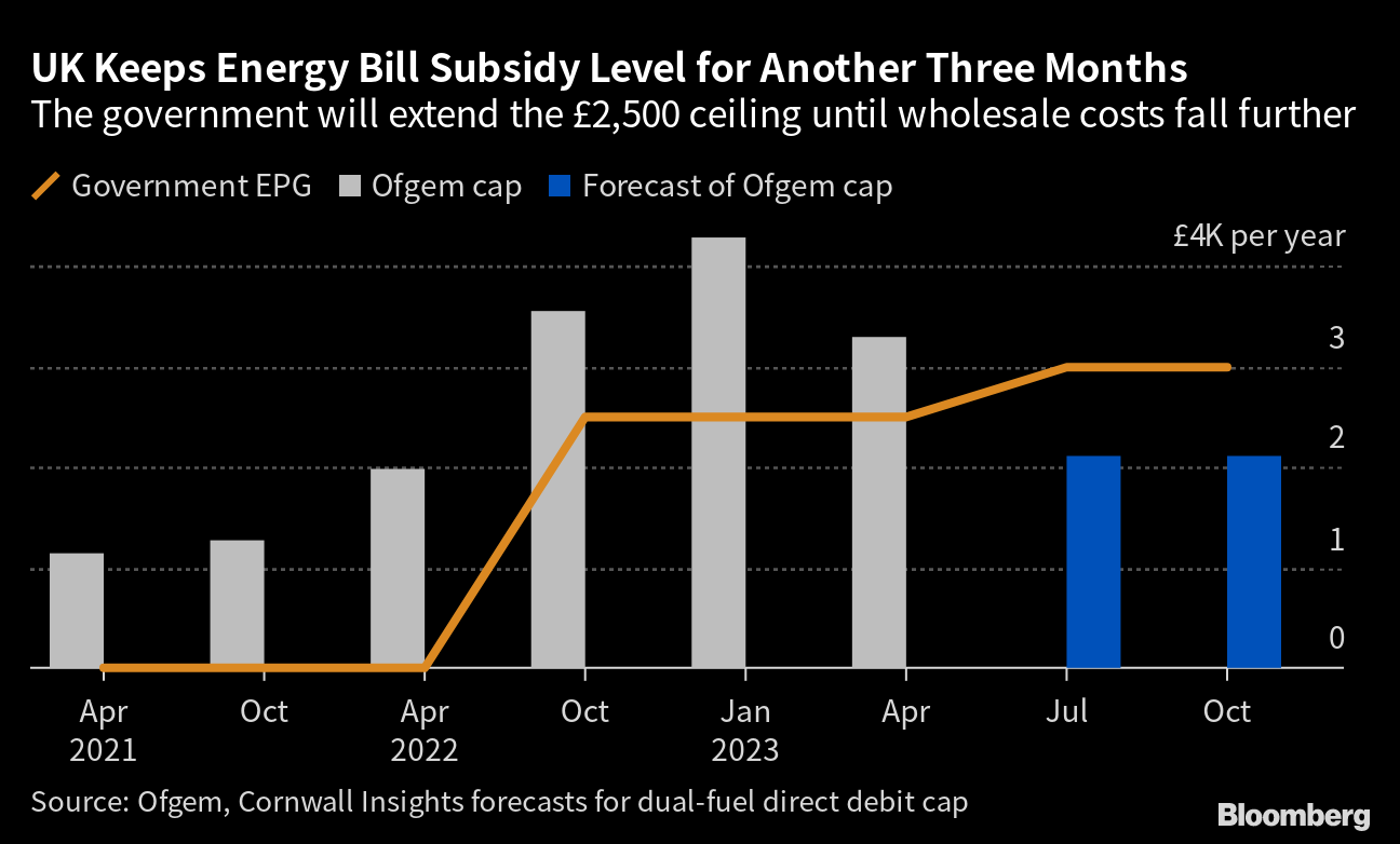 The government moved to prevent an expected £500 increase in annual energy costs for consumers in April. Goldman Sachs Group Inc. has said keeping the EPG unchanged will help UK inflation ease to 1.8% later this year from more than 10% now.