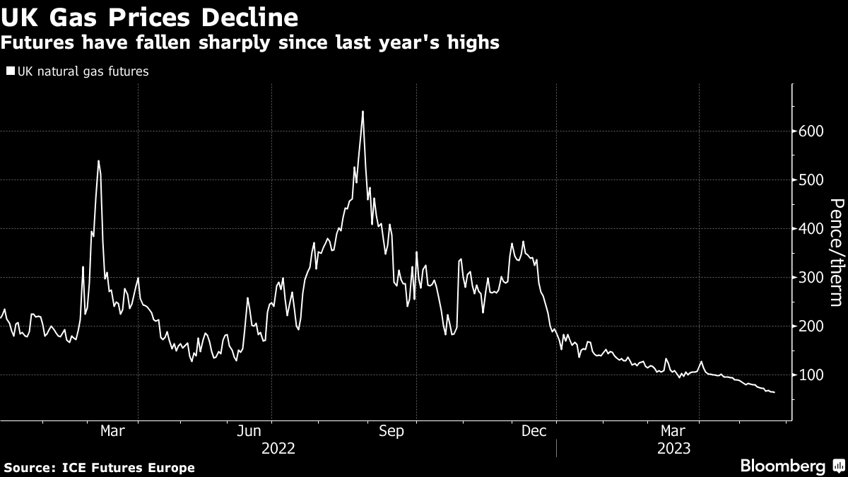 Benchmark gas futures in the UK and Europe are down about 65% this year. Cornwall Insight forecasts the British price cap will stay fairly flat through next winter. That could help customers lock in lower rates if energy suppliers once again start offering fixed-price deals that disappeared when market volatility soared.