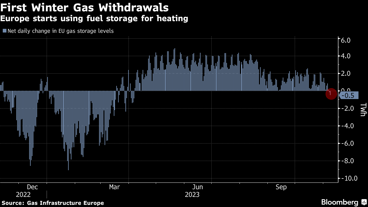 (Bloomberg) -- European natural gas traders have started taking fuel out of the region’s record inventories as colder weather settles in, drawing from its buffer against winter supply shocks.