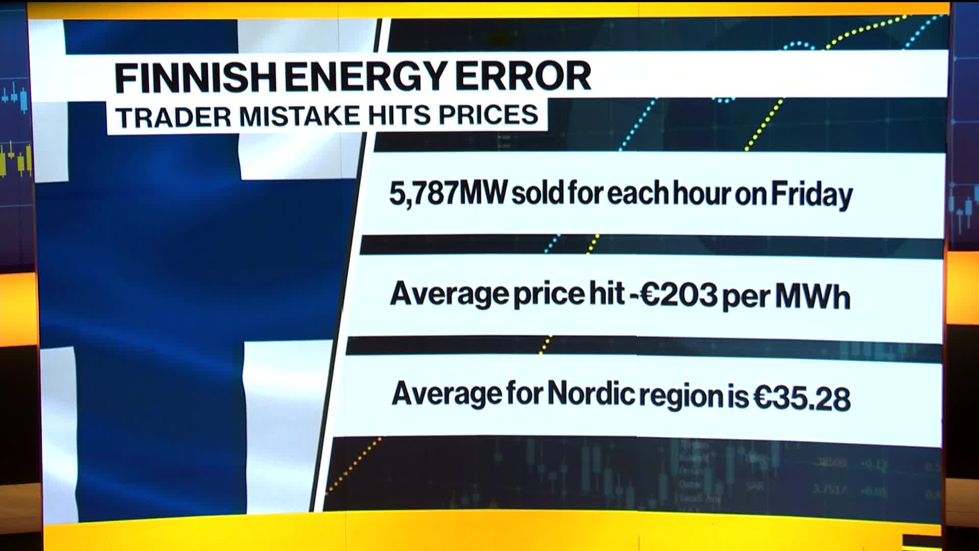 (Bloomberg) -- A power trader error sent shockwaves through the Finnish market as it mistakenly offered to sell the equivalent of at least half the country’s entire consumption at an hourly auction.