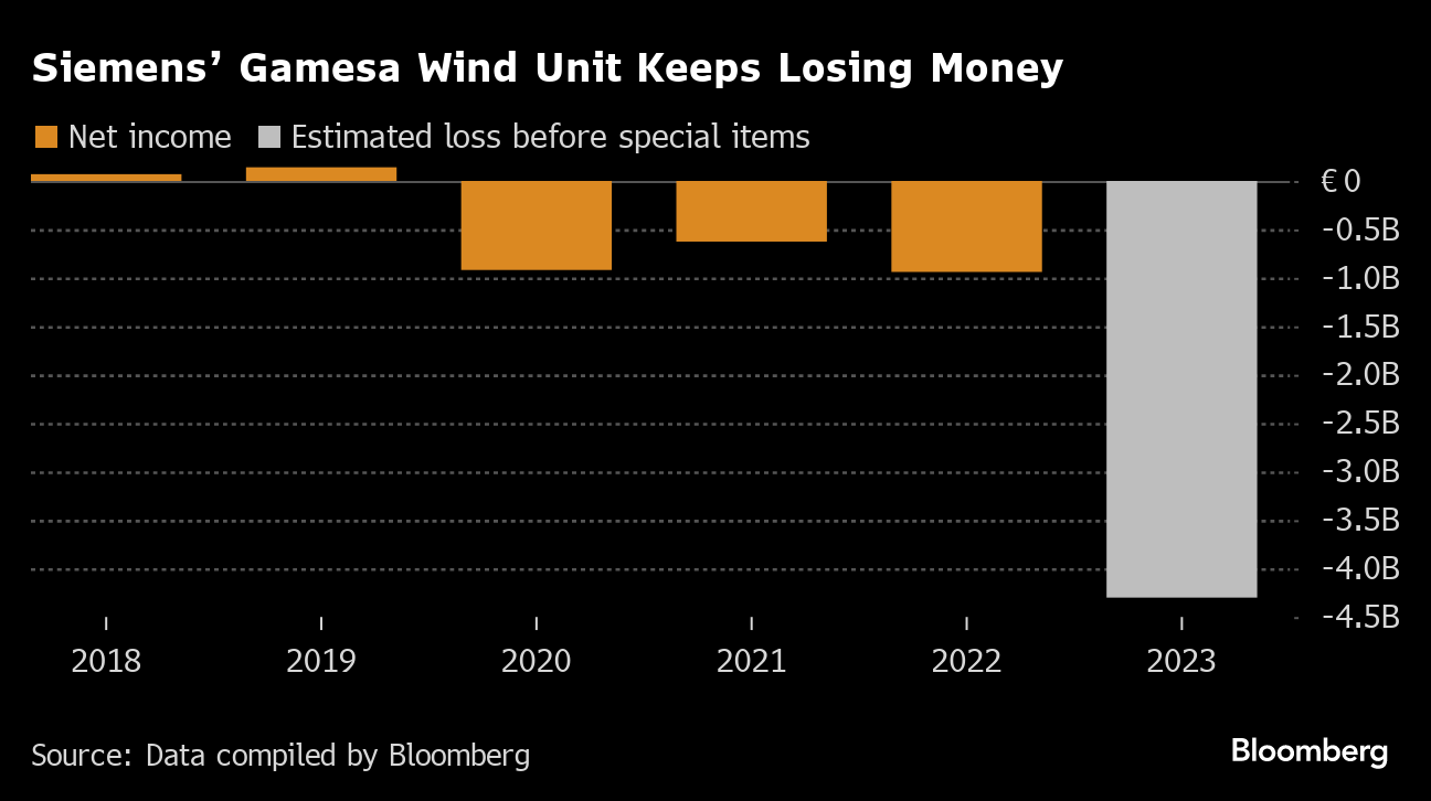 Six years later and the sure-fire bet on surging appetite for carbon-free electricity has turned close to catastrophic. A fault in thousands of wind turbines has left Siemens Energy AG, spun out of the mothership in 2020, on the hook for a repair bill of at least €1.6 billion ($1.7 billion) alongside an expected €4.5 billion net loss for the year.