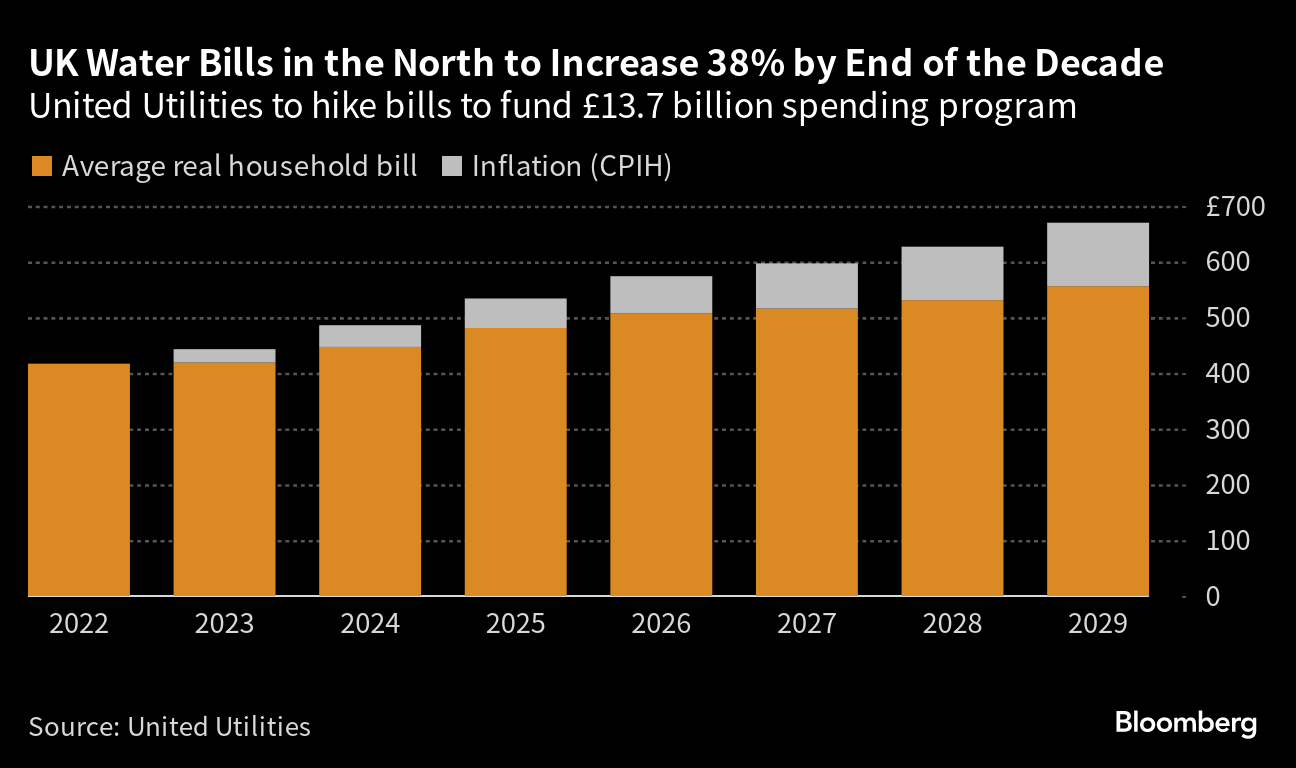 (Bloomberg) -- Water bills for households in England are set to rise by 35% on average by the end of the decade as suppliers ramp up investment to expand and fix leaky networks.