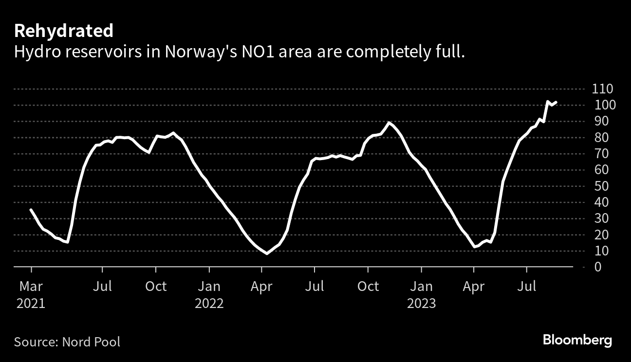 Swedish utility Bixia AB expects rates to be 60% lower in the fourth quarter compared with a year earlier, while on Monday, Oslo and Bergen face negative power prices for the full 24-hour period. That’s after a deluge lasting a few weeks replenished reservoirs in a region where hydropower dominates electricity production. Gas storage sites on the continent are also almost full, which helps to bring down prices.