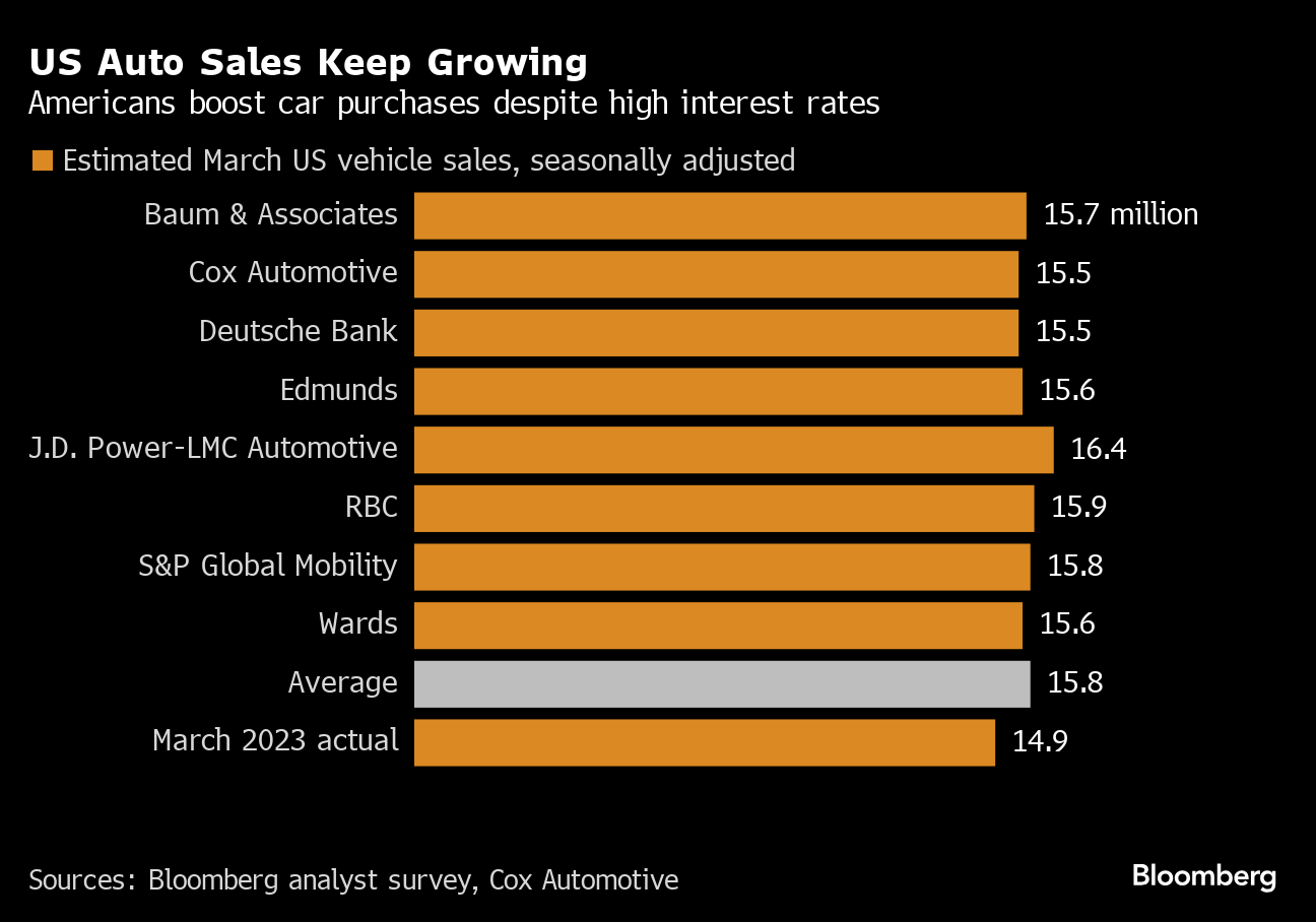 The industry’s yearly sales pace, known as the seasonally adjusted annual rate, rose to about 15.8 million in March, up from 14.9 million a year ago, according to the average estimate of eight analysts surveyed by Bloomberg. The 3.8 million vehicles sold in the first quarter mark a 6% increase from a year ago, but a 3.1% drop from the final quarter of 2023, Edmunds said.