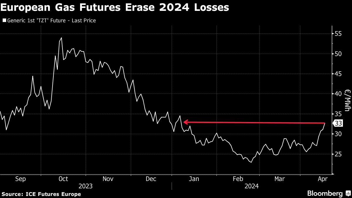 (Bloomberg) -- European natural gas prices erased 2024’s losses as energy markets feared a broader escalation of the conflict in the Middle East after top Israeli military officials reasserted that their country has no choice but to respond to Iran’s weekend attack.