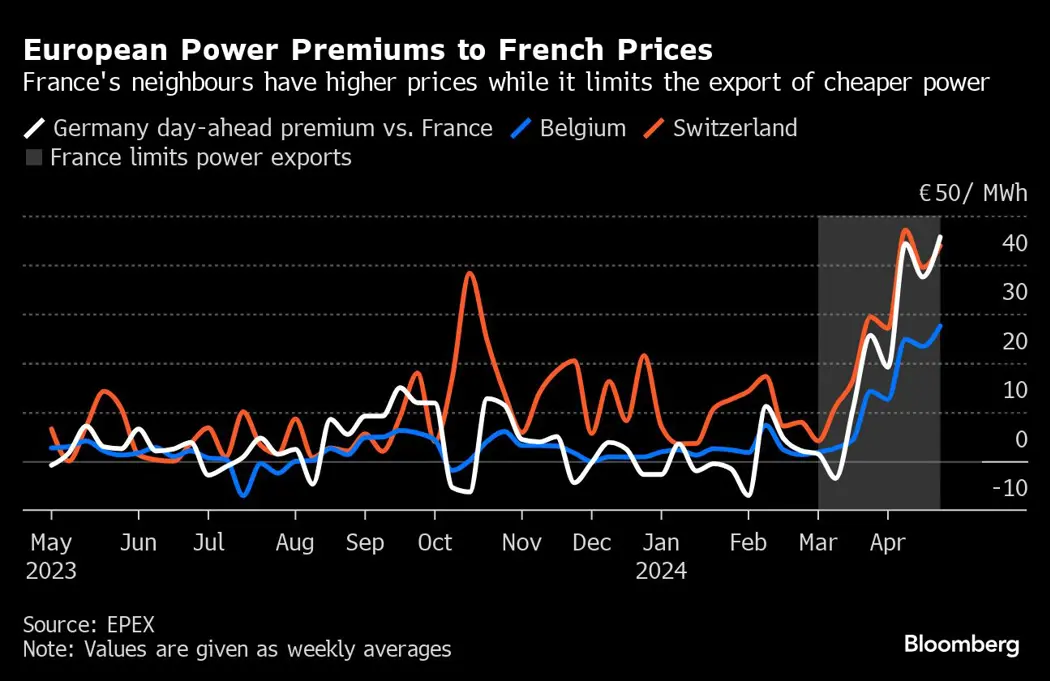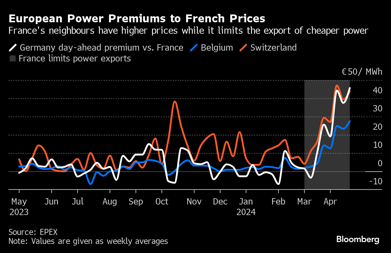 The capacity for transmitting electricity to Belgium, Germany, Switzerland and Italy has been reduced since early March, according to French power-grid operator RTE. That’s depriving those nations of exports of cheaper French nuclear power and boosting wholesale prices across the region. The constraints should be resolved by early May, according to RTE, but more curbs are likely from mid-August.