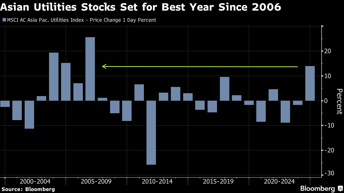 Up nearly 14% since the year began, the MSCI Asia Pacific Utilities Index is on track for its strongest annual gain since 2006. It ranks second, behind tech, in the list of 11 sub-gauges under MSCI’s broader Asian benchmark.