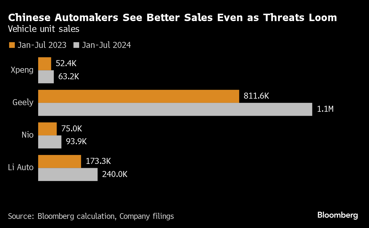 (Bloomberg) -- Chinese automakers including Xpeng Inc., Geely Automobile Holdings Ltd. and Xiaomi Corp. should all report higher vehicle sales, though challenges remain as competition heats up and the European Union moves ahead with tariffs.