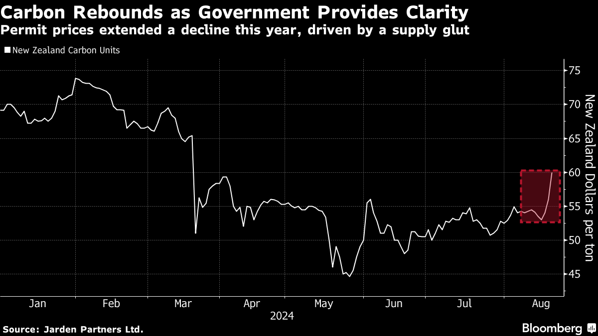 The spot price of carbon units climbed as much as 9% to NZ$61 ($37) a ton Tuesday, the highest since March. The government plans to more than halve the number of units to 21 million from 45 million between 2025 and 2029 to stimulate businesses to reduce emissions.