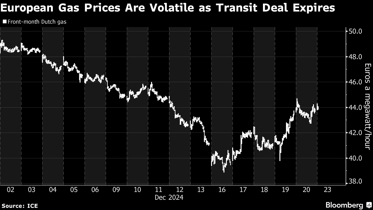 (Bloomberg) -- European natural gas prices fluctuated near €44 a megawatt-hour with little over a week left until the expiry of a key pipeline transit deal between Russia and Ukraine.