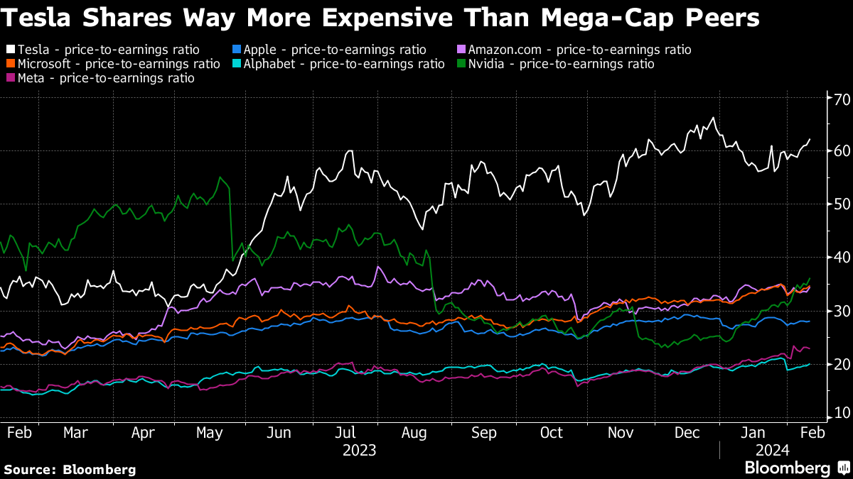 The double trouble of slowing EV demand and shaky AI credentials make it hard for investors to swallow Tesla’s sky high valuation. Even with this year’s selloff, the stock trades at over 60 times forward earnings. The second-most expensive Magnificent Seven stock is Nvidia Corp. at around 36 times forward earnings, while the rest trade between the low twenties and low thirties.
