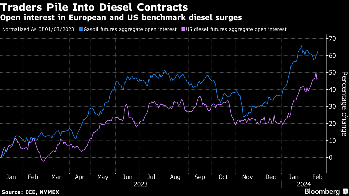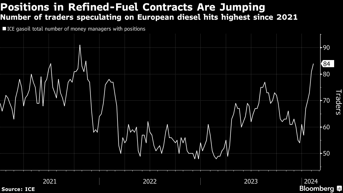 The number of money managers holding positions in Europe’s benchmark diesel contract rose to the most since 2021 last week, and the US diesel contract also achieved a similar milestone.