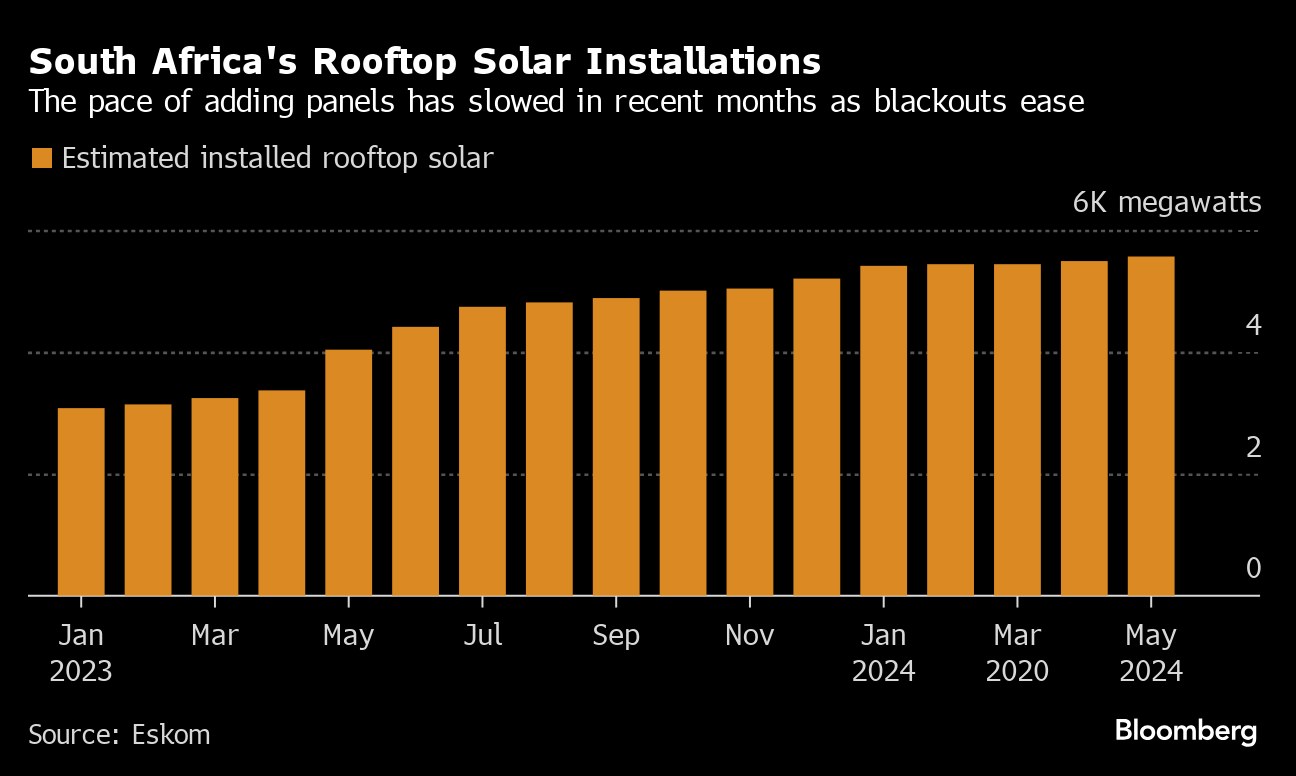 The escalation of outages in the last couple of years caused a surge in demand for solar panels and batteries, with the flow of photo voltaic cells and modules from China to South Africa exceeding $180 million for the month of May alone, according to data compiled by Bloomberg NEF. That’s dropped considerably, with imports not exceeding $40 million since August last year, the data show.