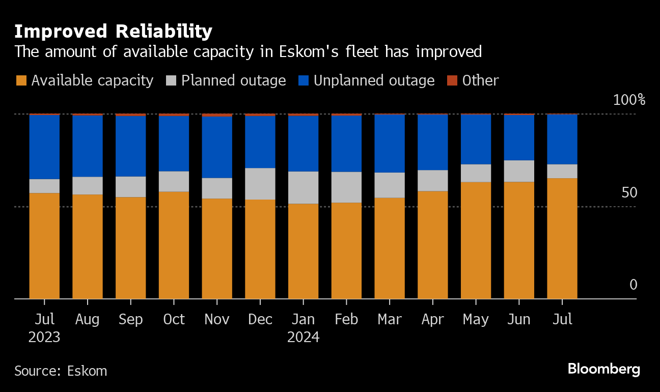 While Eskom warns the danger of loadshedding remains, the situation may continue to improve. The utility plans to bring coal and nuclear units online before 2025 that would improve the proportion of available generation capacity that’s dipped as low as 51% over the last year and improved to 65% this month, according to Eskom data.