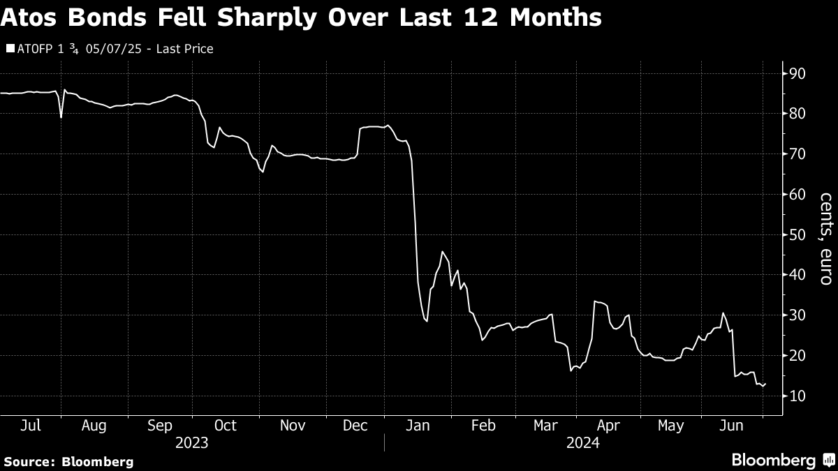 Atos bonds due 2025 briefly rose over 1.5 cents in Monday morning trading, before paring gains. They remain deep in distressed territory, trading at just under 12 cents on the euro.
