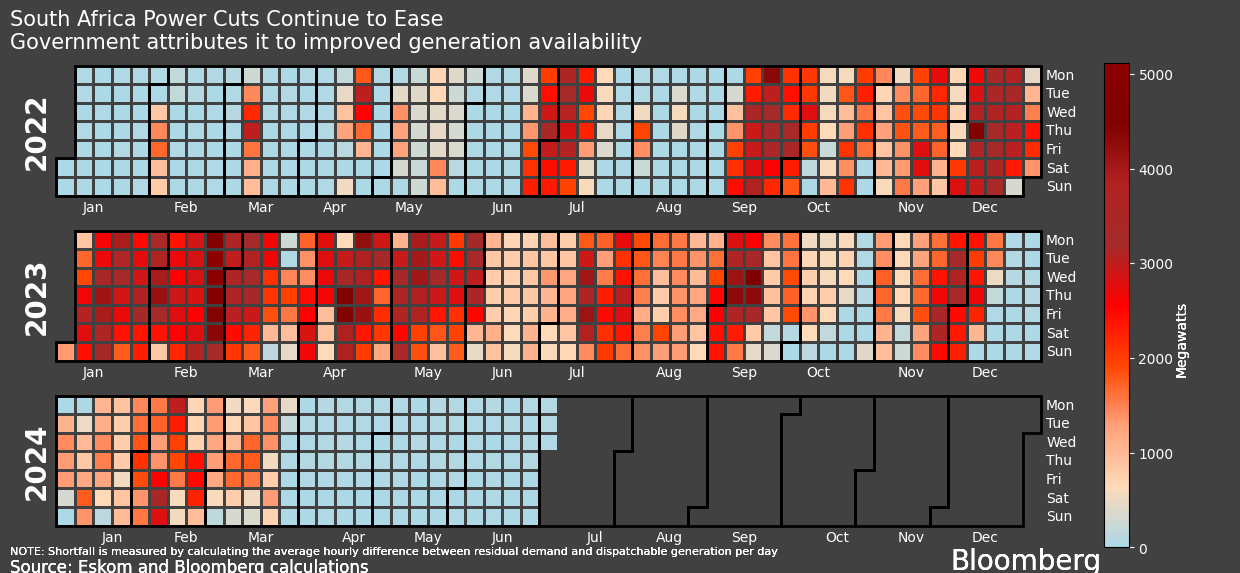 Eskom has routinely implemented rolling power cuts which can lead to daily outages of at least up to 10 hours — known locally as load shedding. The nation’s energy crisis has hurt economic activity and in 2023 resulted in GDP growth of just 0.7%, the slowest rate of expansion since the pandemic in 2020.