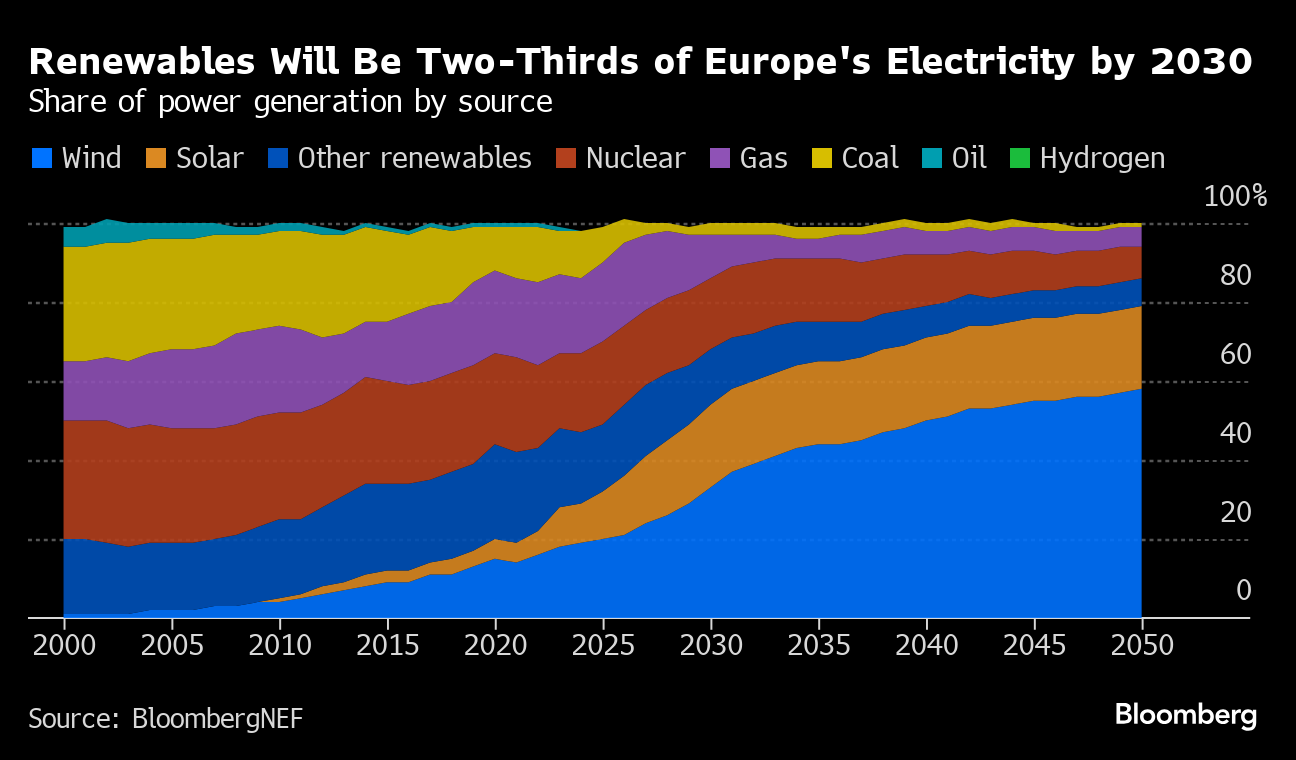 The regular occurrence of subzero prices may become the new normal, BNEF says, as Europe will generate more than two-thirds of its power from renewable sources by 2030.