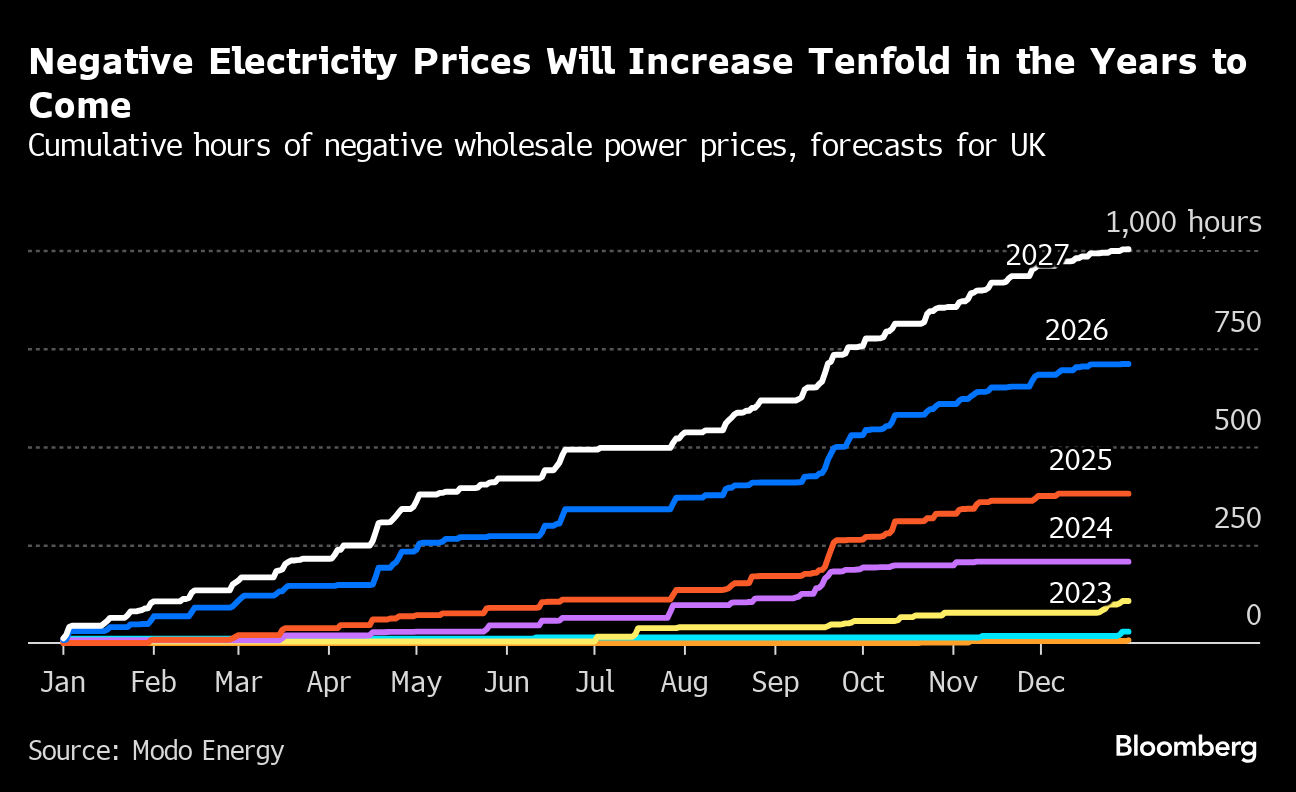 In the UK, the number of negative hours will grow fivefold by 2027 to surpass 1,000, industry consultant Modo Energy said.