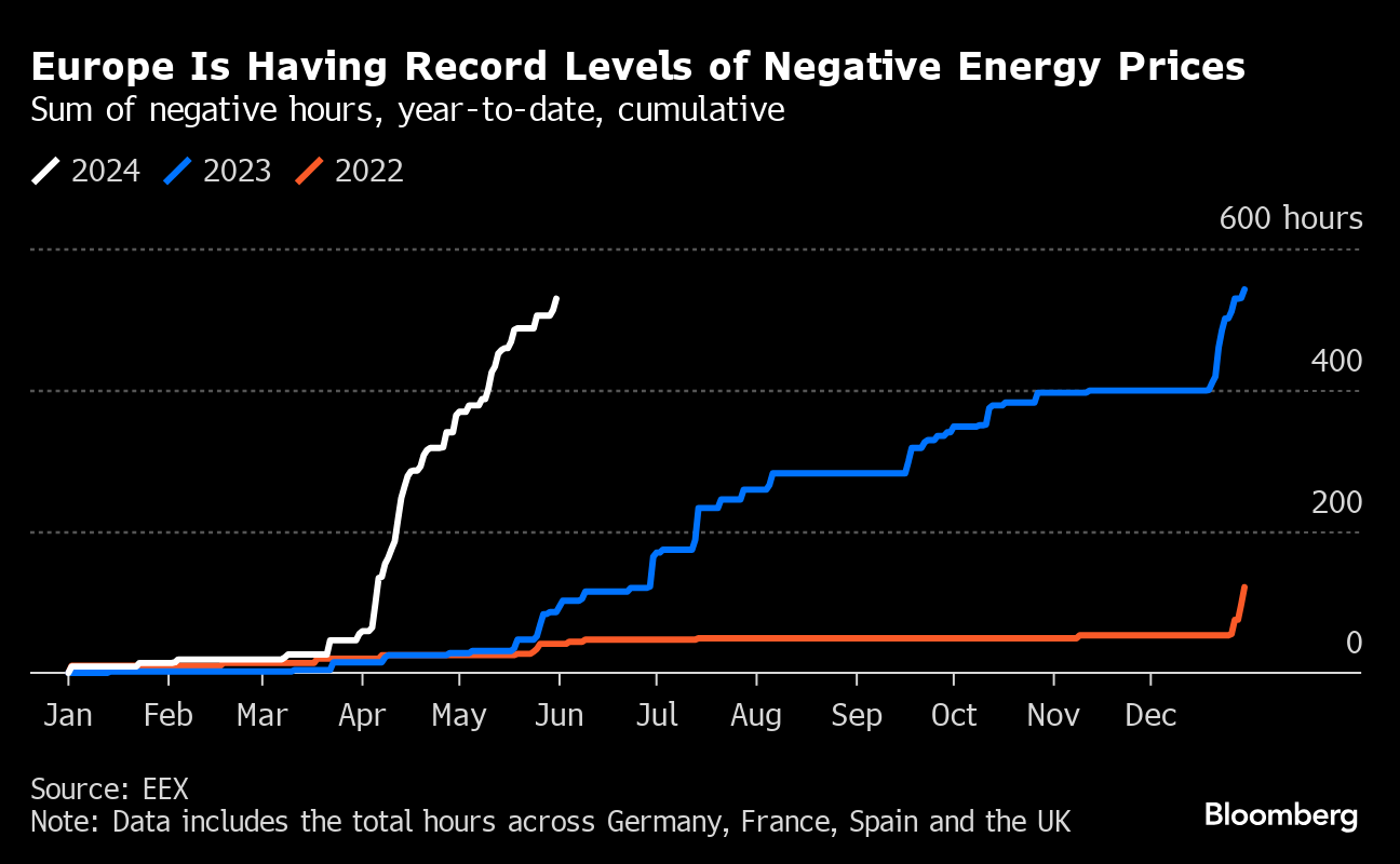 Germany, Europe’s biggest power market, had about 300 hours with prices below zero last year. That may double in 2024, according to energy analytics firm EnAppSys Ltd.