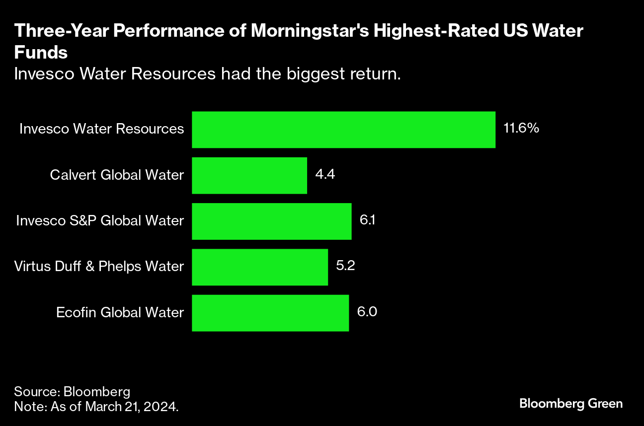 The $2.1 billion Invesco Water Resources exchange-traded fund (ticker: PHO) is by far the industry’s largest fund. Other offerings that make Morningstar’s list of highest-rated funds are Calvert Global Water (CFWAX), Invesco S&P Global Water ETF (CGW), Virtus Duff & Phelps Water (AWTPX) and Ecofin Global Water (EBLU).