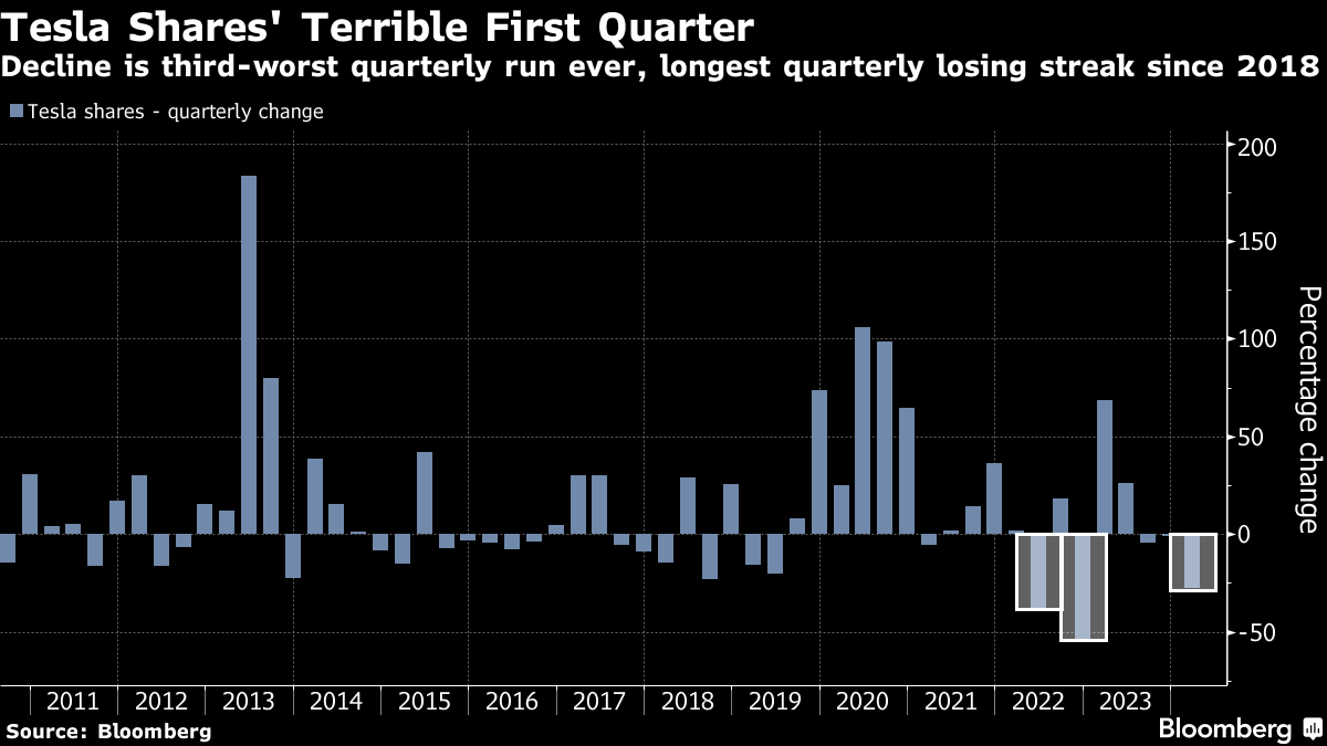 The soon-to-end first quarter will rank among the stock’s three worst ever. The EV maker is the biggest percentage decliner on the S&P 500 so far this year. The stock has given up all its gains since mid-May, and has erased over $350 billion from its market capitalization since touching a 52-week high in July. Shares fell again in early trading Thursday, sliding as much as 2.3%.