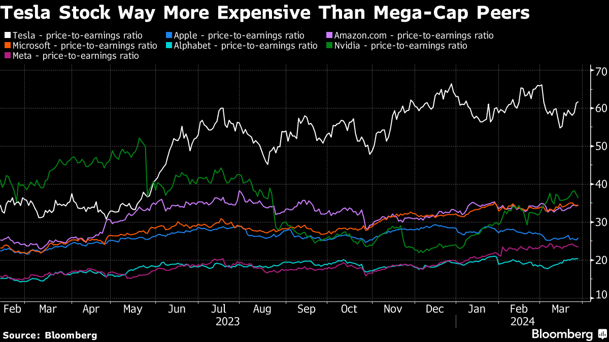 Several analysts cut estimates just this week. Mizuho Securities’ Vijay Rakesh noted that EV sales expectations were decelerating faster than expected. Rakesh estimates EV sales will grow about 15% over last year in 2024, down from his prior expectation of 25%. And Sanford C. Bernstein’s Toni Sacconaghi said that as growth expectations decline, the stock increasingly looks expensive compared to large-cap tech companies.