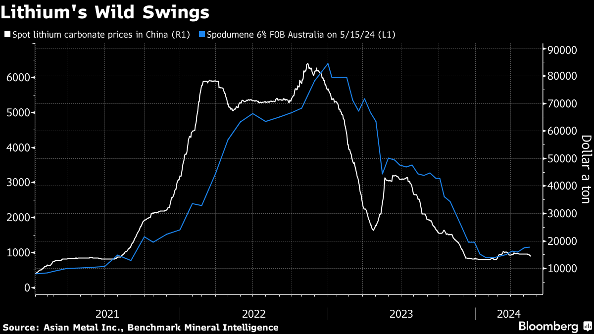 Lithium prices are coming out of a boom-to-bust period that left in its wake an array of stalled projects, scrapped deals and production cuts. One measures of prices — for lithium carbonate in China — is about 80% below its levels at the peak of a boom in 2022. The market is still grappling with inflated inventories from that period.