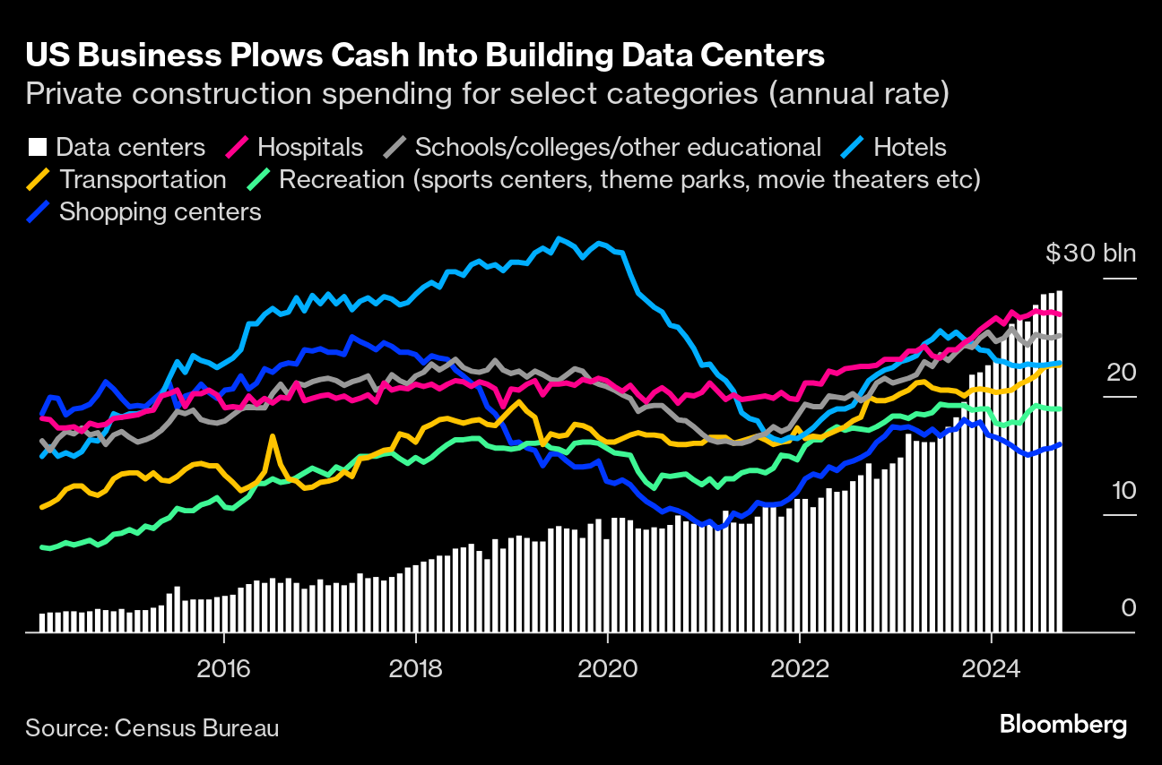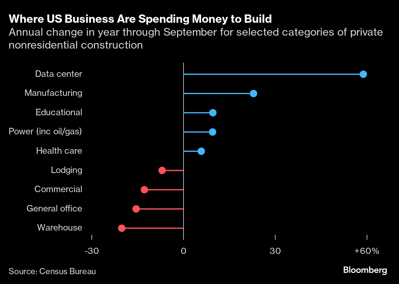 The Census Bureau only started publishing separate numbers for data centers in July this year. Until then, it was subsumed in the office category. At the start of last year, data centers accounted for less than one-sixth of overall office construction, but now the share has climbed above one-third.