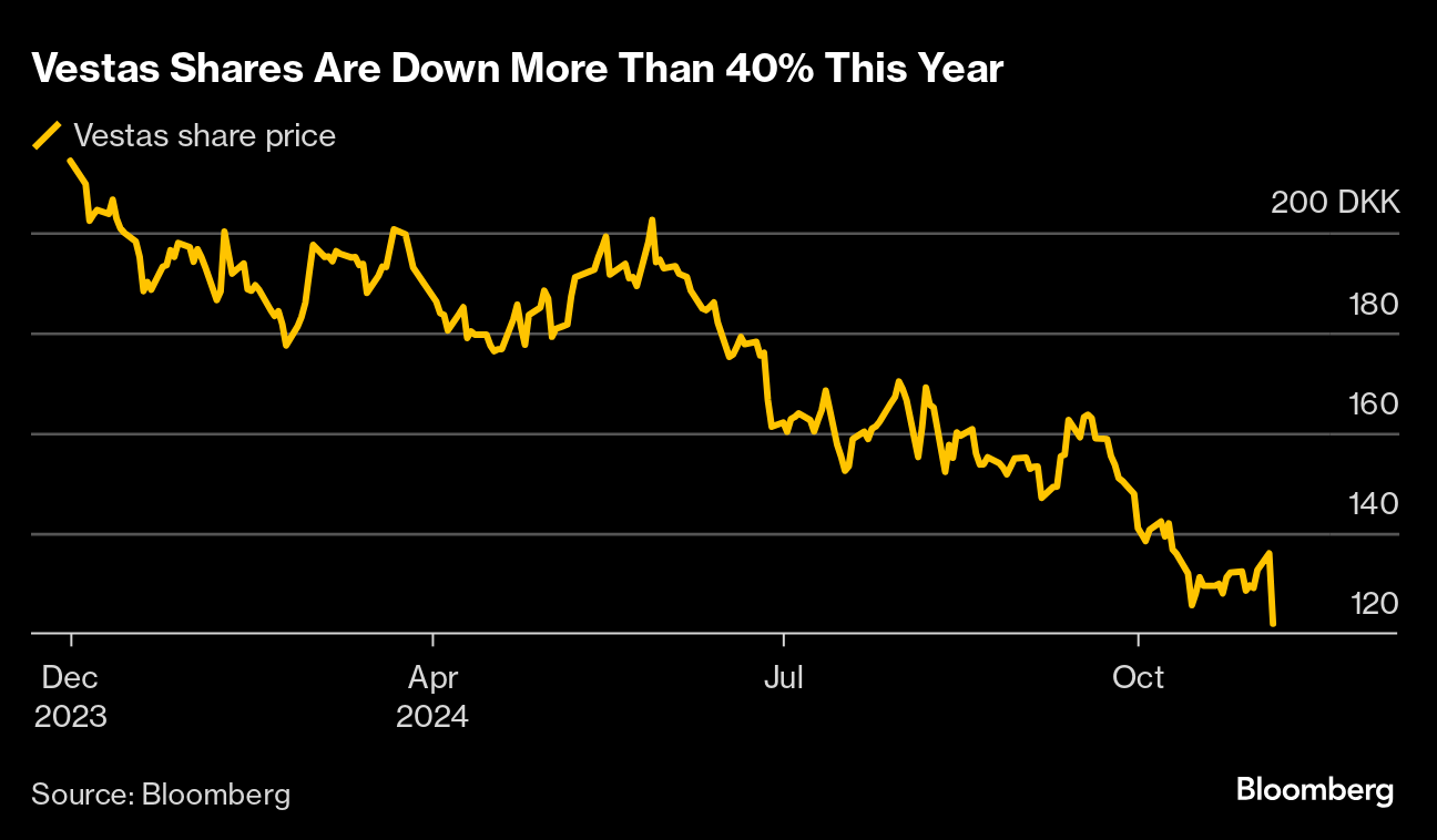 Shares in Vestas fell as much as 12% to 119.65 Danish kroner in Copenhagen, the biggest drop since December 2021.