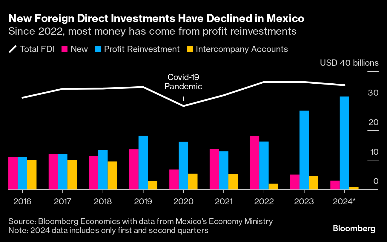 Already, Mexico’s economic growth is expected to slow to an estimated 1.5% in 2024, according to a Citigroup Inc. survey of more than two dozen analysts, down from 3.2% in 2023. Since 2022, foreign direct investment flows have mostly come from reinvestments by companies already operating in Mexico, rather than fresh bets, said Felipe Hernandez, who covers Latin America for Bloomberg Economics.
