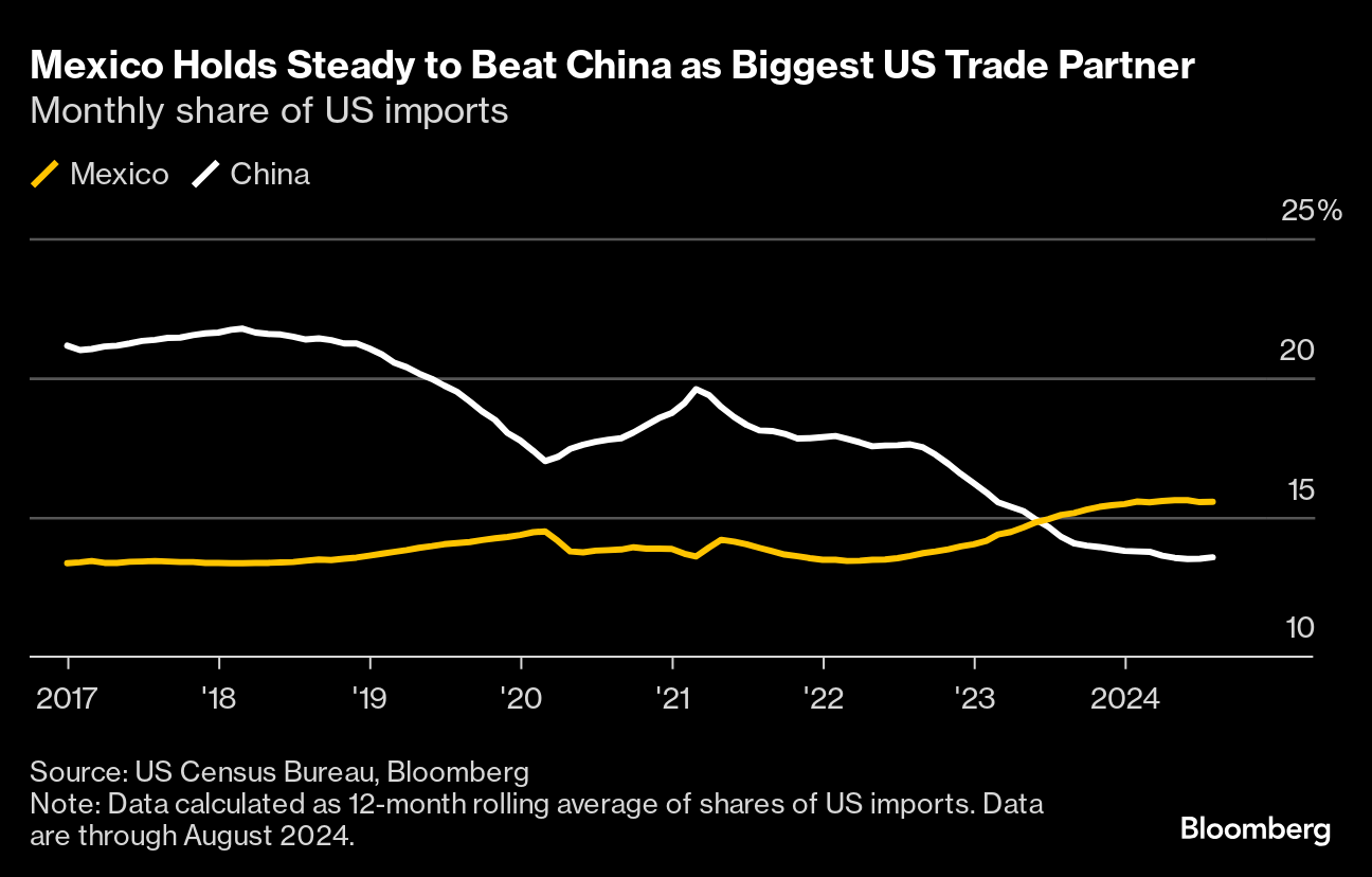 Sheinbaum named former Foreign Minister Marcelo Ebrard economy minister, putting a seasoned politician in charge of the talks. Ebrard is betting that the shifts in the geopolitical agenda create incentives for North American countries to strengthen the regional bloc and reduce their reliance on imports from China and other parts of Asia, a message that could play well with either Trump or Harris.