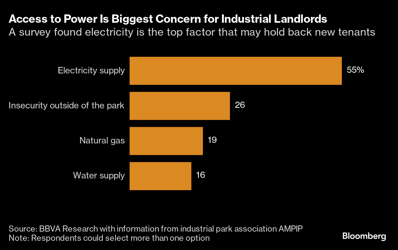 Access to electricity is a top concern for industrial real estate owners. Lopez Obrador changed regulations to cement state control of the power industry, stopping public auctions for electricity generation and capping private sector involvement. The nation’s transmission and distribution capacity hasn’t kept up with demand, especially in the north, leading some parts of the country to experience widespread seasonal blackouts. Red tape often means that industrial parks that build their own electricity substations have long waits before the facilities can operate.